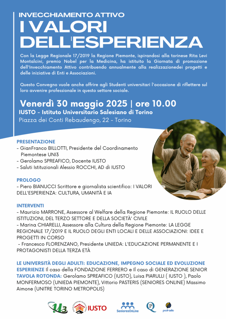 Venerdì 30 maggio 2025 dalle ore 10:00 presso IUSTO – Istituto Universitario Salesiano di Torino, Piazza dei Conti Rebaudengo, 22 a Torino si svolge l’evento 2025 per la giornata regionale per la promozione dell’invecchiamento sano e attivo in Piemonte. Il titolo dell’edizione…